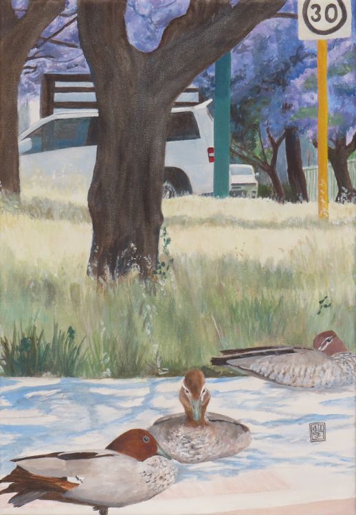 The vacant lot is on a corner of Ruislip Street, West Leederville, Perth, in spring when the jacaranda trees were in bloom. Wood Ducks were the inspiring companions for this setting. |
